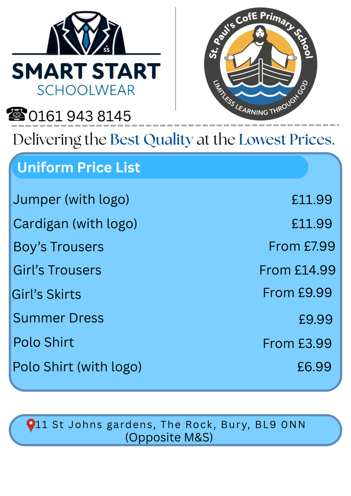 At St. Paul’s CE Primary School, we wear our uniform with pride to celebrate the fact that we are a part of the St Paul’s Family. Our school uniform consists of: